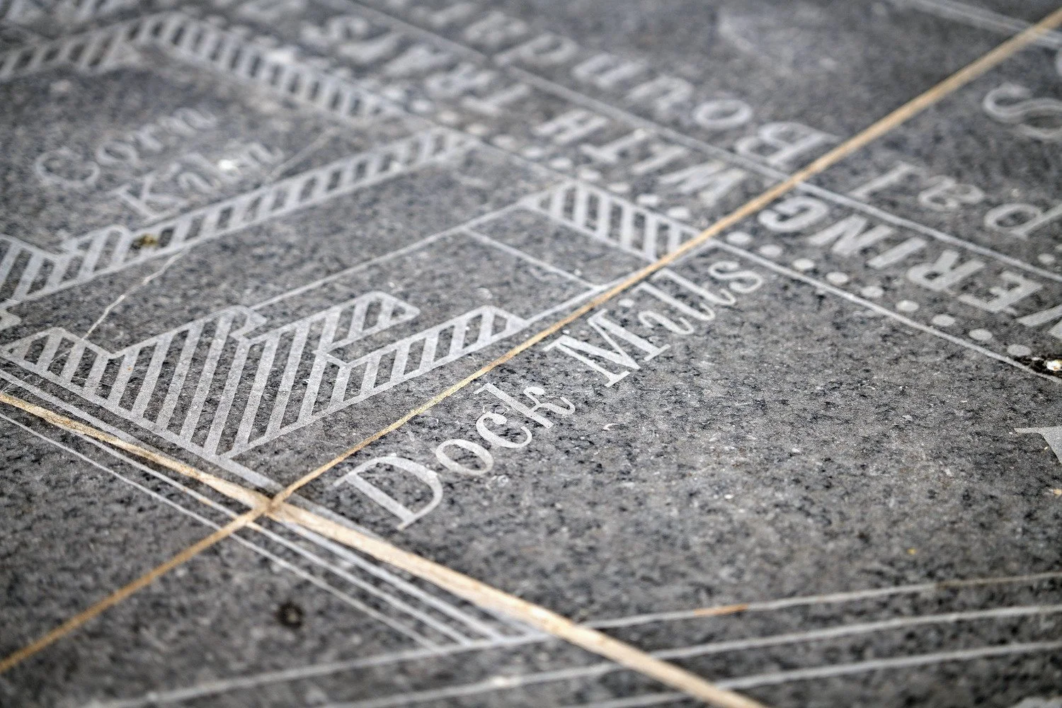 A Dock Edge Screen was developed as part of the environmentally conditioning of Bolands Square, as the south westerly winds can be strong across the open water. Originally conceived as a portable with moveable screens, it is layered with greater meaning with the introduction of laser cut text from a 19th Century account of the mills in operation. We collaborated with Sean Atmos and Begley Hutton to finalise a form and aesthetic that defines the dock edge and provides a highly visible local landscape for the new public spaces.