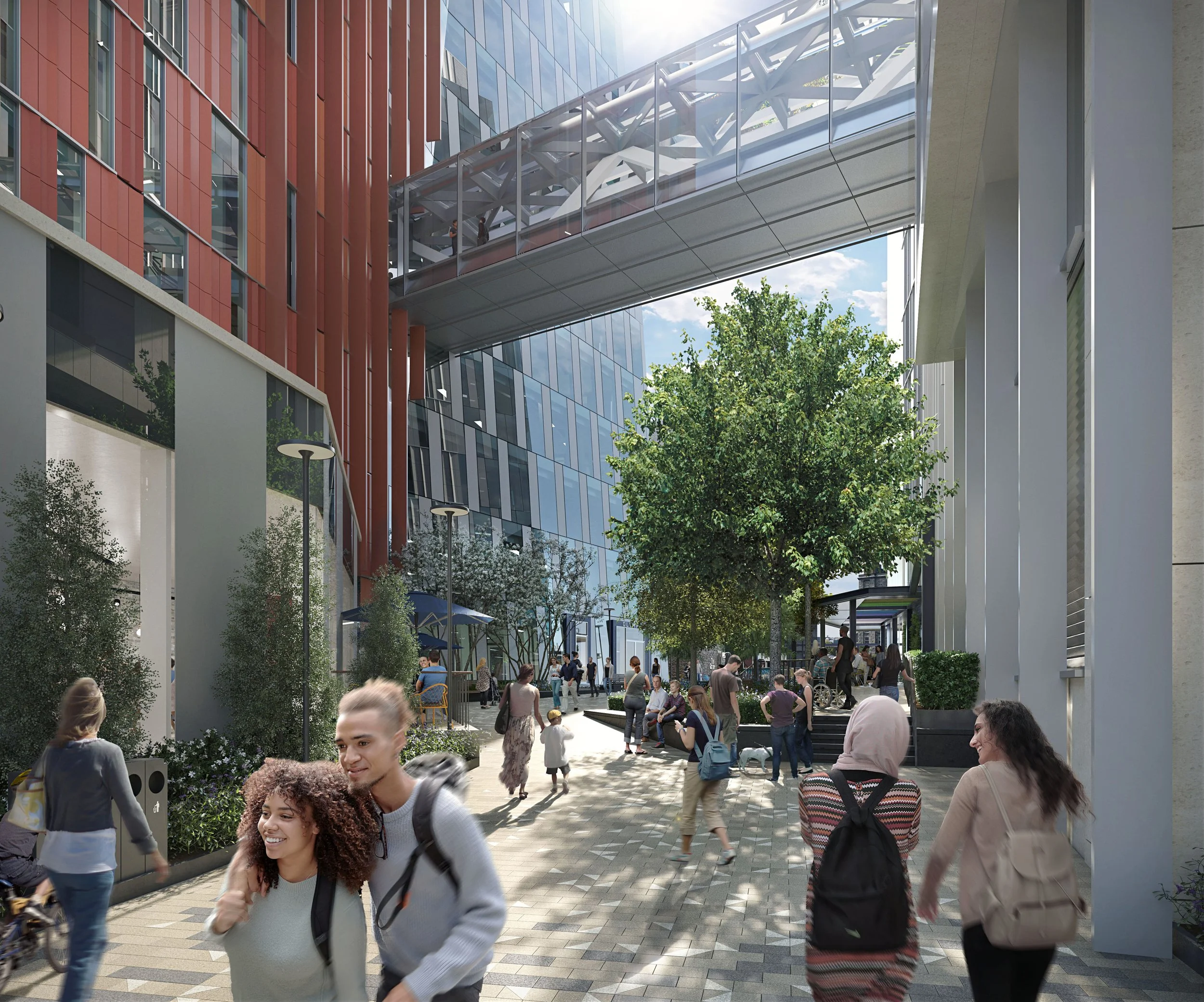 Thermal comfort for external activities has been carefully considered through the sensitive placement of different activities in the landscape responding to environmental conditions. Alongside retail terraces, the landscape seating material and inclusive features support longer dwell times. Wind mitigation canopies, both in the landscape and buildings, enhance outdoor comfort and support year round activities. Bolands Mills’ series of streets and squares are framed by trees and dense planting to elevate the experience, improve wellness for visitors.