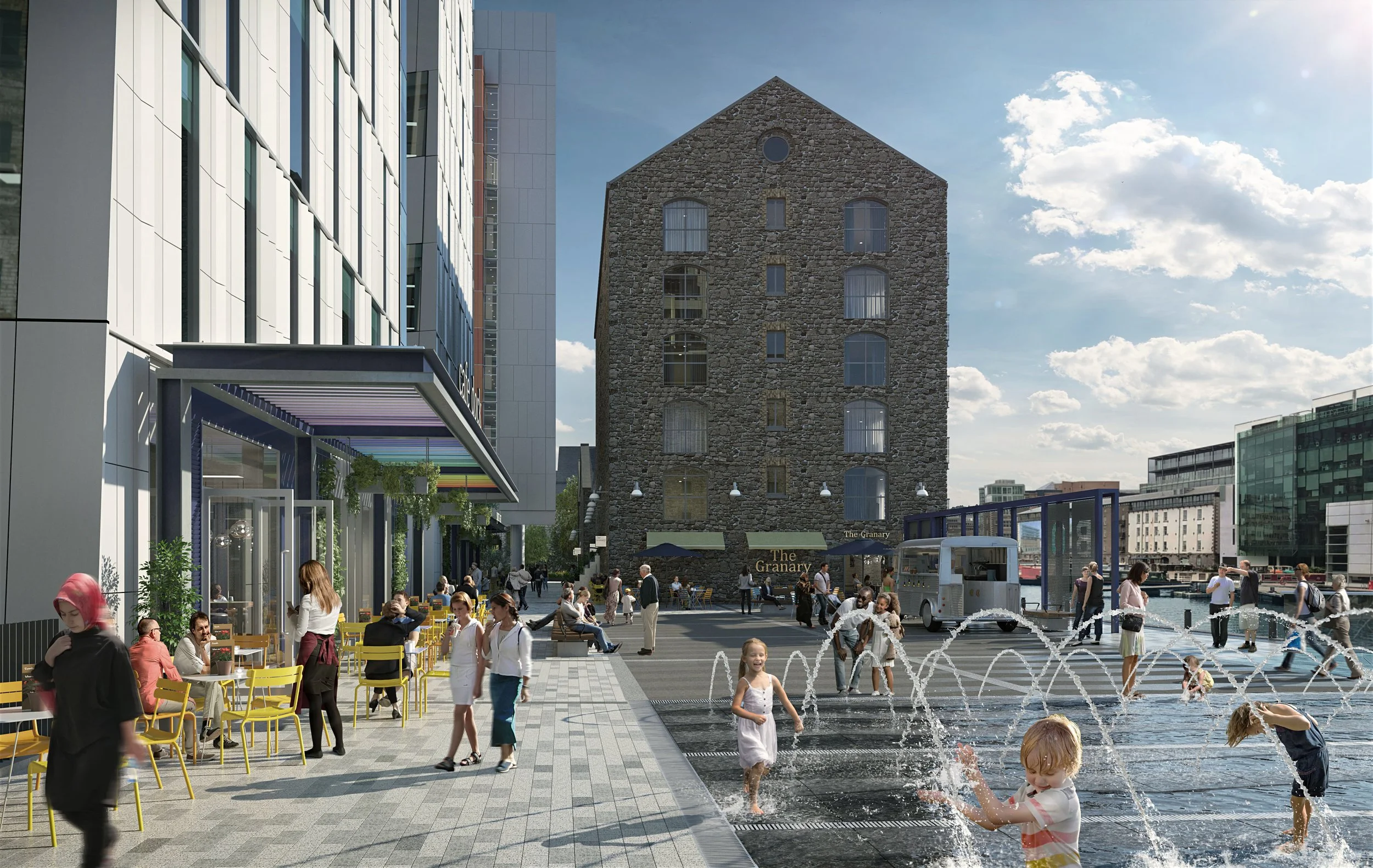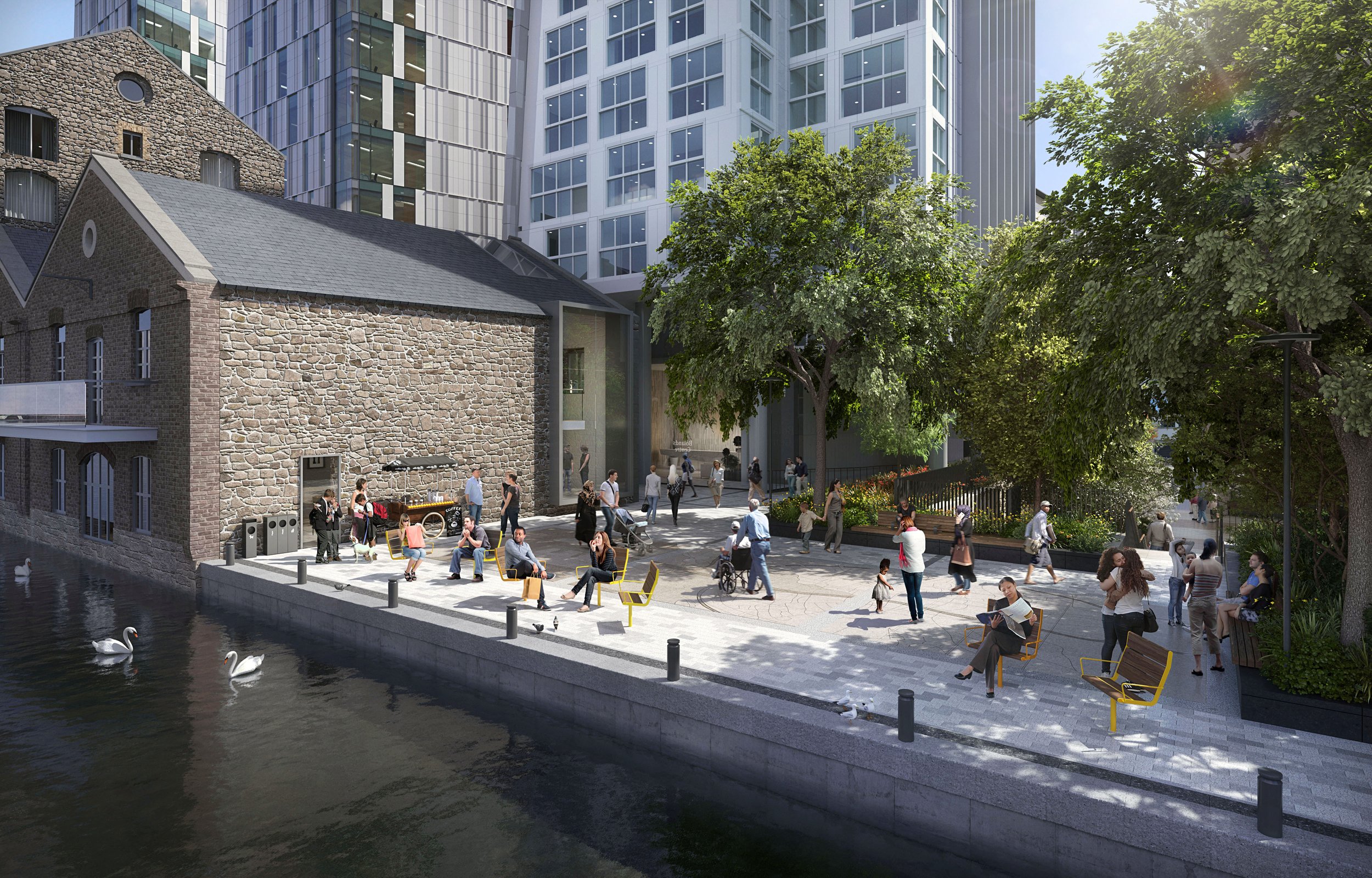 The landscape draws on the rich historical context to inform a series of narratives that celebrate the people and place through art, paving, water features that layer memories and stories of the past into the public realm. Special moments such as the historical map in Canal Bank Square, or the delineation of the original grain silos in the paving, provide a tangible connection to the past uses of the site.