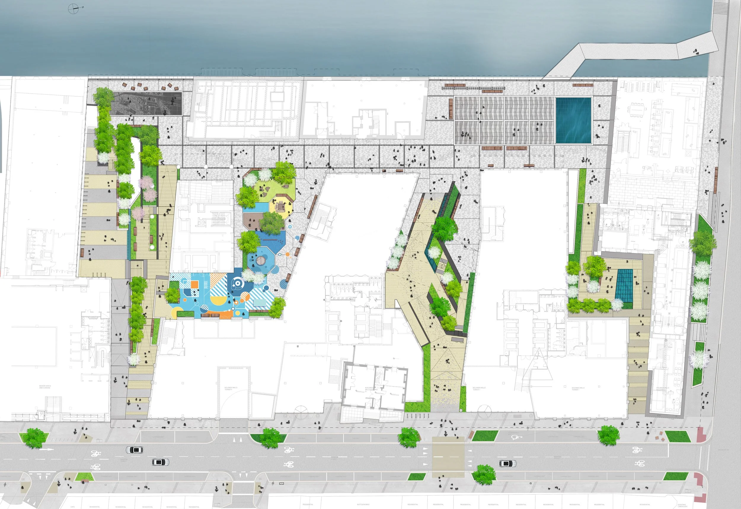 We worked with our client, Google, to design a universally accessible public realm, bringing activities and nature to a previously inaccessible site. Proposed as a multi-generational space; seating, planting and the integration of water draw on all senses and support users of all abilities. The new streets and squares connect into Barrow Street, Ringsend Road and the wider residential neighbourhood to create a new social hub for Grand Canal Dock.