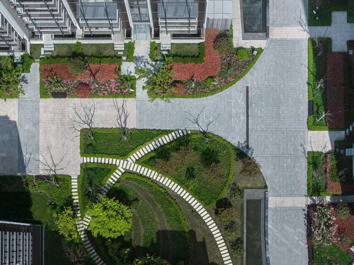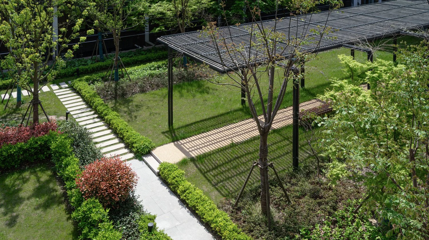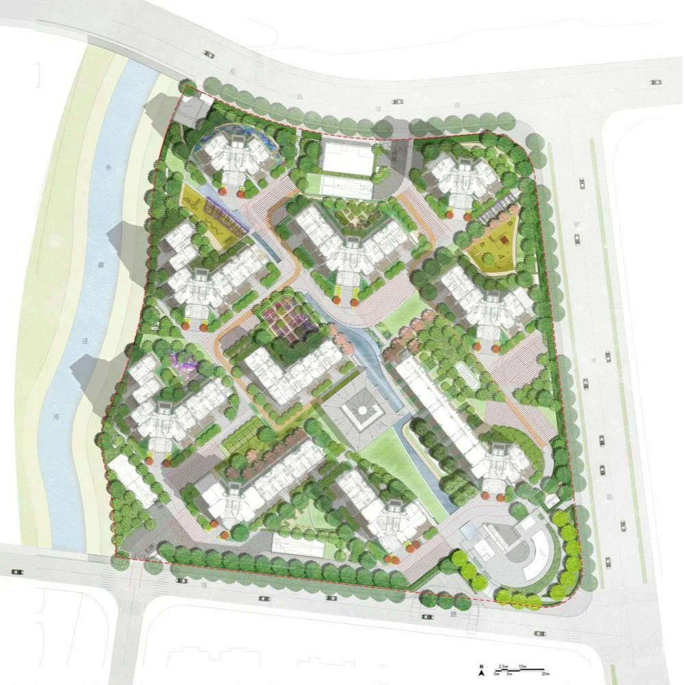 The site is a residential project in Shanghai consisting of residential towers and apartment blocks designed by Roger Stirk Harbour & Partners (RSHP), embedded in a landscape of approximately 2.5 hectares. The concept inspiration for the landscape design arose out of the site’s location close to Sijing Town. ‘Sijing’ translates as ‘4 rivers’, as the town is located on a junction where 4 streams meet. The river provided good transport connections for business and Sijing Town became a rich town near Shanghai. The four rivers, symbolizing wealth and well-being, became the guiding principle for the landscape concept