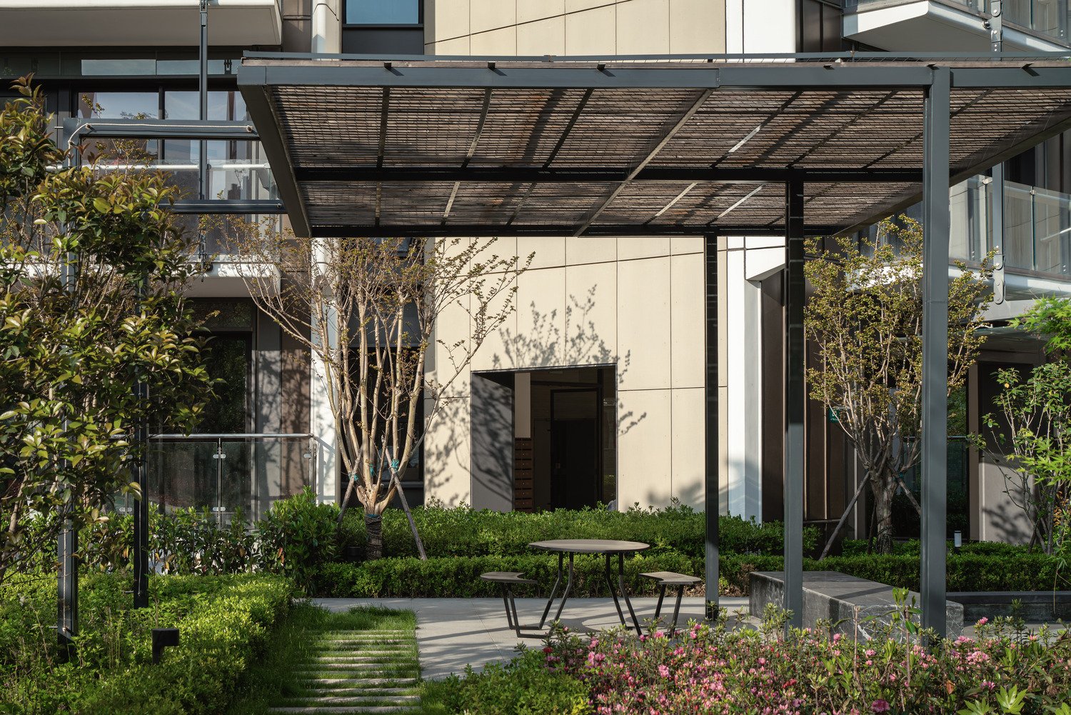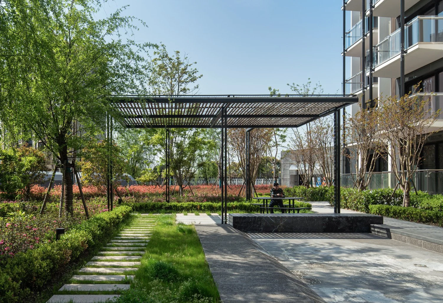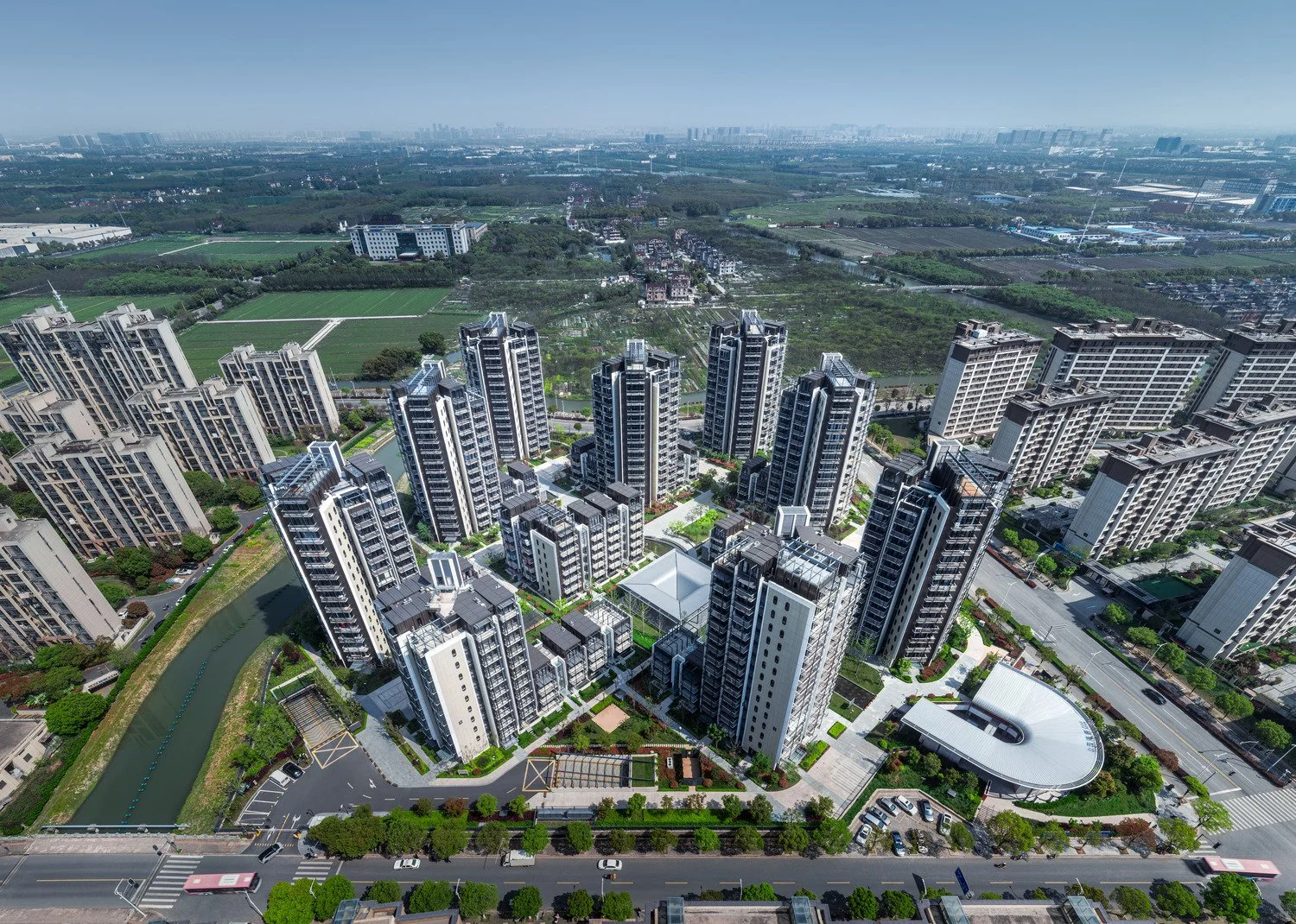 The site is a residential project in Shanghai consisting of residential towers and apartment blocks designed by Roger Stirk Harbour & Partners (RSHP), embedded in a landscape of approximately 2.5 hectares. The concept inspiration for the landscape design arose out of the site’s location close to Sijing Town. ‘Sijing’ translates as ‘4 rivers’, as the town is located on a junction where 4 streams meet. The river provided good transport connections for business and Sijing Town became a rich town near Shanghai. The four rivers, symbolizing wealth and well-being, became the guiding principle for the landscape concept