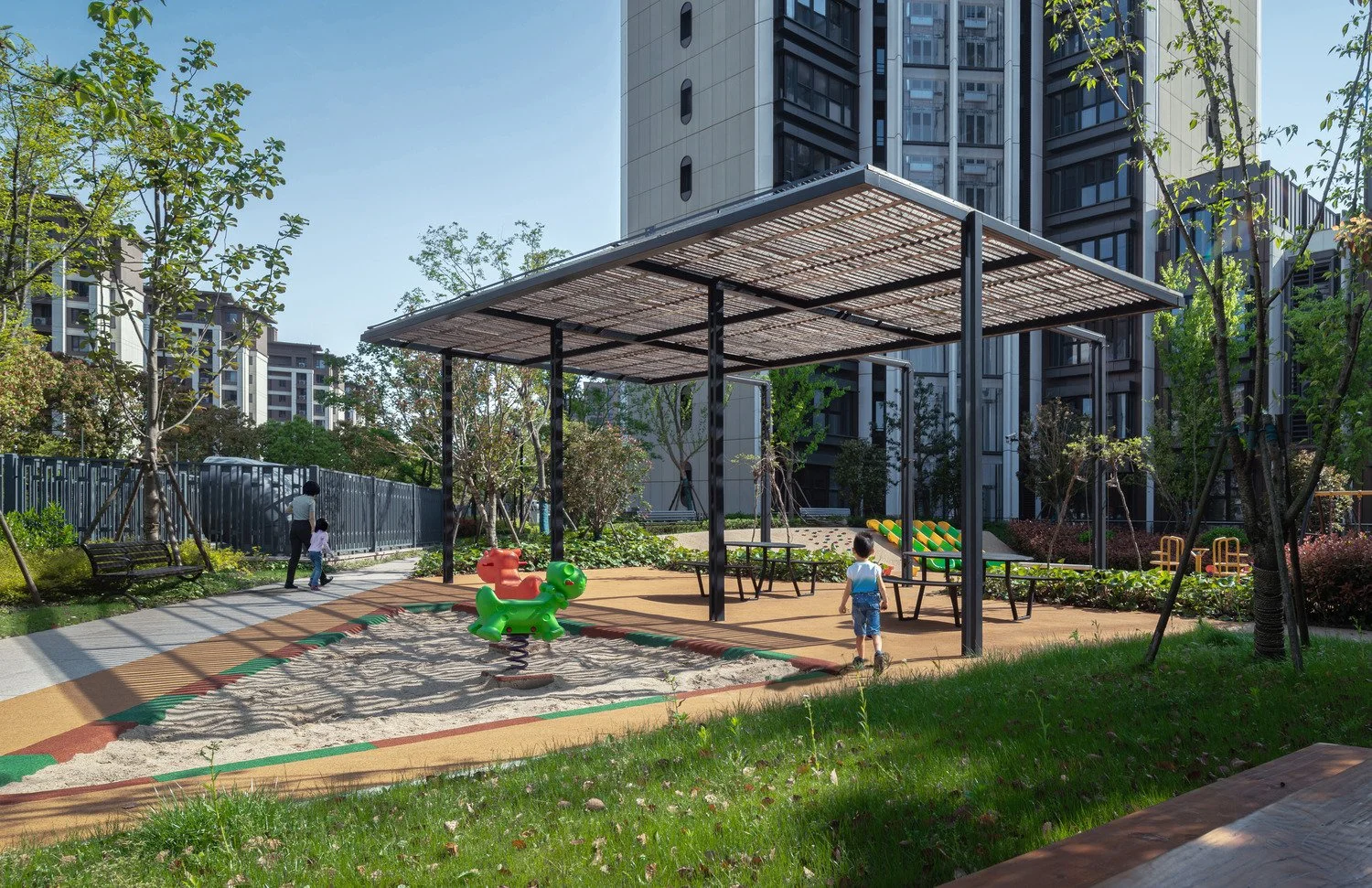 Public space shared by the residents frames the club house, one of the major shared facilities for the residents. Play and sports are distributed across the site.